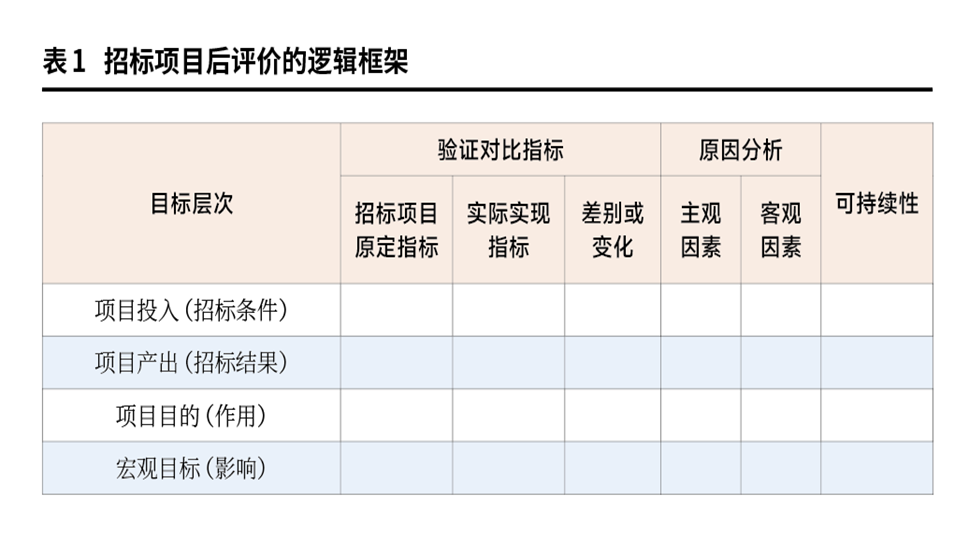 逻辑框架分析法适用于项目各阶段,以评价本次采购对于整体及全过程的影响。逻辑框架分析的结论回答了三个问题:一是招标原定目标是否已经达到以及达到的程度、原定的目标是否符合项目要求,二是项目概算(估算)、供货期、进度、质量等指标是否已经实现或实现的程度,三是招标采购每项结果对项目整体的影响是否具有可持续性。