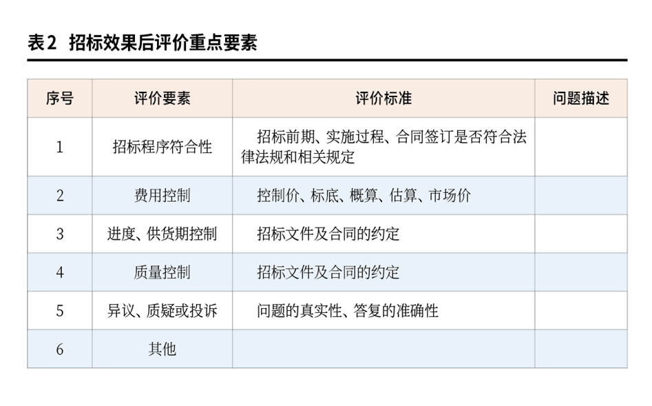 后评价关注的重点要素应根据招标项目效果实际情况而定,因为招标项目出现的问题不尽相同,最终影响的是招标效果,如中标人履约情况、费用控制、质量控制、工期或供货期、后期服务等,而影响招标效果的因素隐含在招标过程每一个环节中。招标效果后评价重点要素见表2。