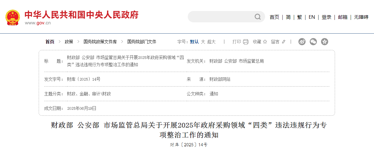 财政部 公安部 市场监管总局关于开展2025年政府采购领域“四类”违法违规行为专项整治工作的通知