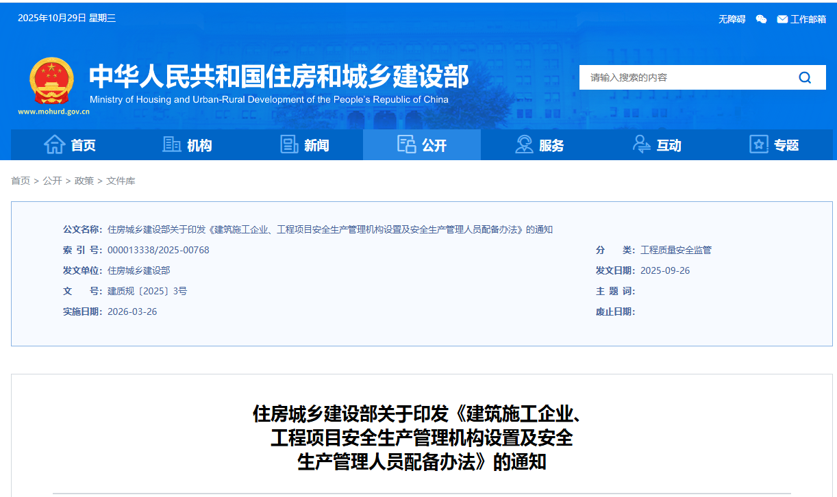 住房城乡建设部印发《建筑施工企业、工程项目安全生产管理机构设置及安全生产管理人员配备办法》,对企业及项目的安全生产管理机构设置和人员配备作出详细规定。新规要求特级资质企业至少配备6名专职安全管理人员,项目经理每月带班生产时间不得少于80%,并首次明确安全总监的任职资格。该办法将于发布6个月后正式实施,原有相关规定同时废止。